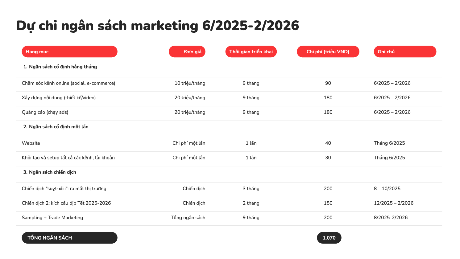 Xác định rõ các mục tiêu truyền thông (VD: tăng 30% nhận biết thương hiệu, đạt 5.000 khách hàng tiềm năng), sau đó liệt kê các hoạt động cần làm để đạt mục tiêu và tính chi phí từng phần.