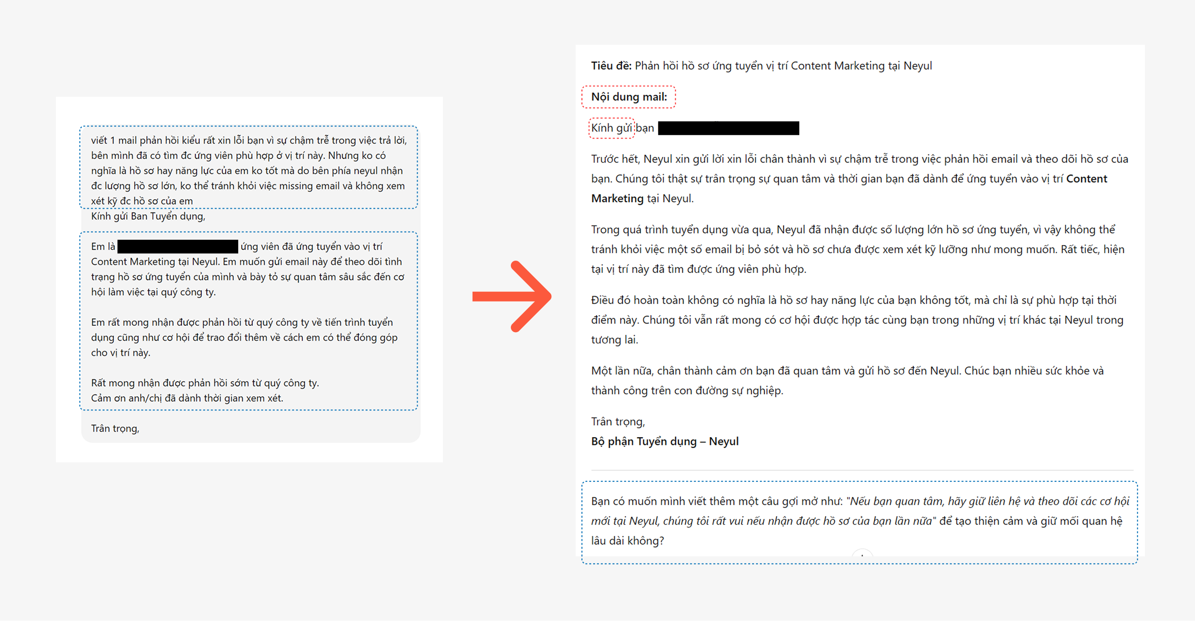 Không chỉ vậy, AI còn giúp tránh lặp từ, điều chỉnh cấu trúc câu sao cho trôi chảy và logic hơn. Nhờ đó, email chuyên nghiệp hơn, người đọc dễ hiểu và dễ tiếp nhận hơn.